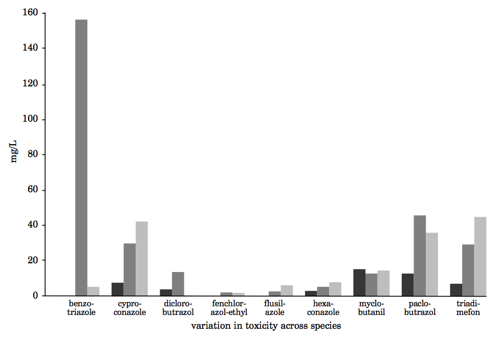 QSAR regression models of the toxicity of triazoles and benzotriazoles ([B]TAZs) to an alga (Pseudokirchneriella subcapitata), Daphnia magna and a fish (Onchorhynchus mykiss), were developed by five partners in the FP7-EU Project, CADASTER. The models were developed by different methods Ordinary Least Squares (OLS), Partial Least Squares (PLS), Bayesian regularised regression and Associative Neural Network (ASNN) — by using various molecular descriptors (DRAGON, PaDEL-Descriptor and QSPRTHESAURUS web). In addition, different procedures were used for variable selection, validation and applicability domain inspection. The predictions of the models developed, as well as those obtained in a consensus approach by averaging the data predicted from each model, were compared with the results of experimental tests that were performed by two CADASTER partners. The individual and consensus models were able to correctly predict the toxicity classes of the chemicals tested in the CADASTER project, confirming the utility of the QSAR approach. The models were also used for the prediction of aquatic toxicity of over 300 (B)TAZs, many of which are included in the REACH pre-registration list, and were without experimental data. This highlights the importance of QSAR models for the screening and prioritisation of untested chemicals, in order to reduce and focus experimental testing.